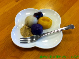 | 材料 54人分(5人分) 【里芋だんご】 里芋 250g【25g】皮を取った状態 白玉粉 400g(40g) 絹豆腐 300g(30g) 水 適量 【南瓜だんご】 南瓜 250g(25g) 白玉粉 400g(40g) 絹豆腐 300g(30g) 水 適量 【紫芋だんご】 紫芋フレイク 75g(8g) 水 180cc(18cc) 白玉粉 400g(40g) 絹豆腐 300g(30g) 水 適量 【トッピング】 こしあん 500g(50g) 水 適量 きな粉 50g(5g) 砂糖 50g(5g) 塩 一つまみ(少々) 作り方 (利用者様が参加されている所は、緑太字にしています) 1.里芋・南瓜を2cm角程度に切って30分蒸す。 2.紫芋フレイクに水を足して、マッシュポテトにする。 3.蒸し上がった里芋・南瓜の皮を剥きつぶす。 4.紫芋・里芋・南瓜それぞれのボールに白玉粉を入れ、豆腐を加えてこねる。耳たぶの硬さになるまで少しずつ水を加えて調節する。 5.それぞれ分割して丸める。 6.熱湯に丸めただんごを入れ、浮いて来たらさらに1分加熱して、冷水に入れ冷ます。 7.ボールにこしあんを入れ、だんごに絡みやすい硬さまで水でのばす。 8.ボールにきなこ・砂糖・塩を加えてまぜる。 9.3色だんご・こしあん・きなこを盛り付ける。 *9月は「中秋の名月」ということで、お月見だんごとなりました。歯切れが良く食べやすいだんごを作るため、白玉粉だけではなく、芋や豆腐を加えました。とても柔らかく「もち~」としただんごが出来上がりました。 *歯切れをよくするため芋類を加えるにあたり「南瓜がきれいだね、紫芋もいいね」と話が盛り上がり、秋の味覚の3色だんごとなりました。 |