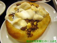| 材料 48枚(12枚) 強力粉 1.2kg(300g) 砂糖 120g(30g) 塩 24g(6g) イースト 24g(6g) ぬるま湯 720g(180g) 油 40g(10g) マシュマロ 330g(80g) 板チョコ ミルク 600g(150g) 板チョコ ホワイト 200g(50g) 作り方 (利用者様が参加されている所は、緑太字にしています) 1.ボールに強力粉・砂糖・塩を入れ、イースト菌はぬるま湯に溶かしてから加え、生地がまとまるまでこねる。 2.1にサラダ油を加え、なめらかになるまでこねる。 3.1時間生地を休ませる。 4.パン生地を分割し、丸めて綿棒でのばし、オーブン200℃で10分焼く。 5.板チョコを刻む。 6.マシュマロが大きい場合は、1/4適度に切る。 7.焼けたパン生地に、チョコとマシュマロをトッピングする。 8.オーブン180℃で5分焼く。 *マシュマロが溶けるとピザチーズのように伸びます。 ミルクチョコとホワイトチョコを3:1の割合で混ぜることで、味に変化が出ます。 *口腔の動きが弱い方は、伸びるマシュマロが口腔内に張り付いて食べづらかったようです。 |